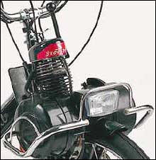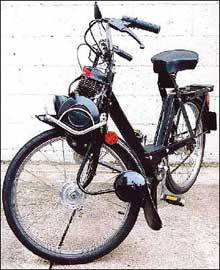 A simplicidade começa pelo pequeno motor acoplado à roda dianteira, enquanto a transmissão é feita por meio de um "rolete" que fica em contato com o pneu dianteiro. O motor pode ser facilmente desacoplado por meio de uma alavanca, até em movimento, transformando o veículo em uma bicicleta comum. Com um cilindro e 49 cm³ de cilindrada, o motor é refrigerado a ar e produz pouco mais do que 0,5 cv de potência. Se faltar força, principalmente em subidas, a energia auxiliar vem dos pedais, movidos a feijão mesmo...