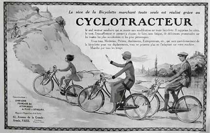 Em 1916, Goudard e Mennesson solicitam uma patente para produzir um motor auxiliar que se posicionasse no centro da roda traseira; em 31 de dezembro de 1917 obtêm a mesma. Em 31 de dezembro de 1918 solicitam uma segunda patente, que é concedida em 26 de maio de 1919; relativa a um veículo de duas rodas composto por um quadro tubular que faz a ligação do banco e ao garfo, com um descanso para os pés, similar a um “U”, com uma suspensão dianteira tipo pendular. Mas entre os anos de 1940 e 1945, enquanto não prestavam serviços nas forças de ocupação da guerra, já havia no mercado a bicicleta motorizada "Cyclotracteur", quando Marcel produziu sua primeira e comercialmente viável "bicicleta assistida por motor", batizada de "VéloSoleX" - a bicicleta que anda sozinha. |