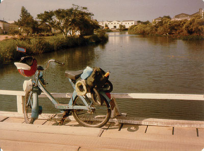 As fotos da minha Velosolex azul são de 1985, ou seja, a motinha já rodava há 11 anos. A outra eu fiz montado em uma Micron, na porta da revendedora Velosolex em Montevidéu.